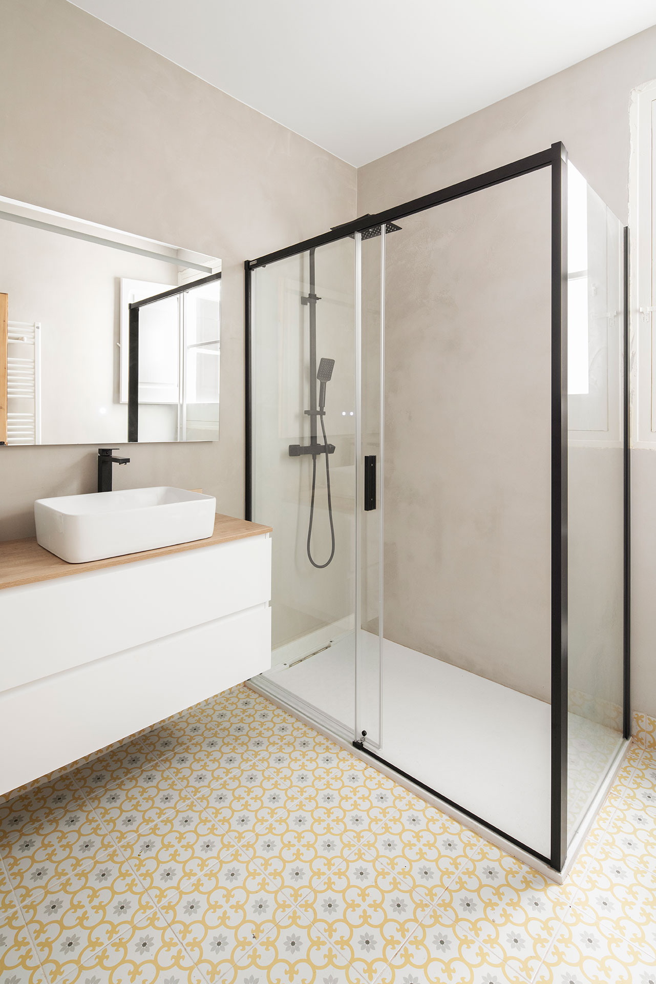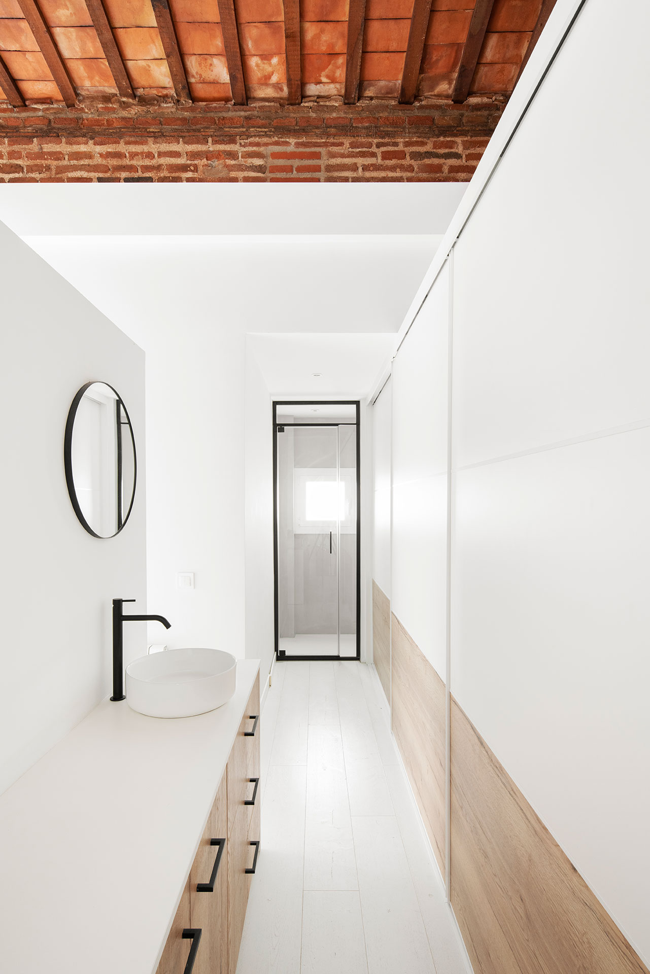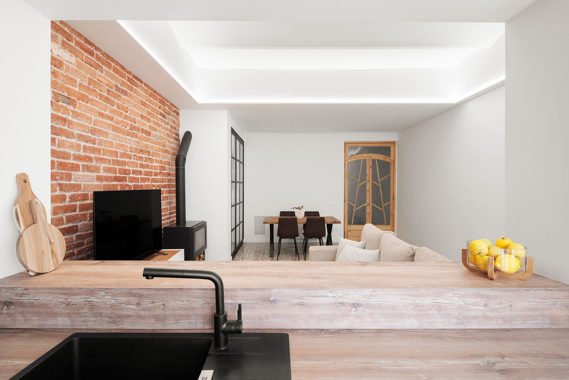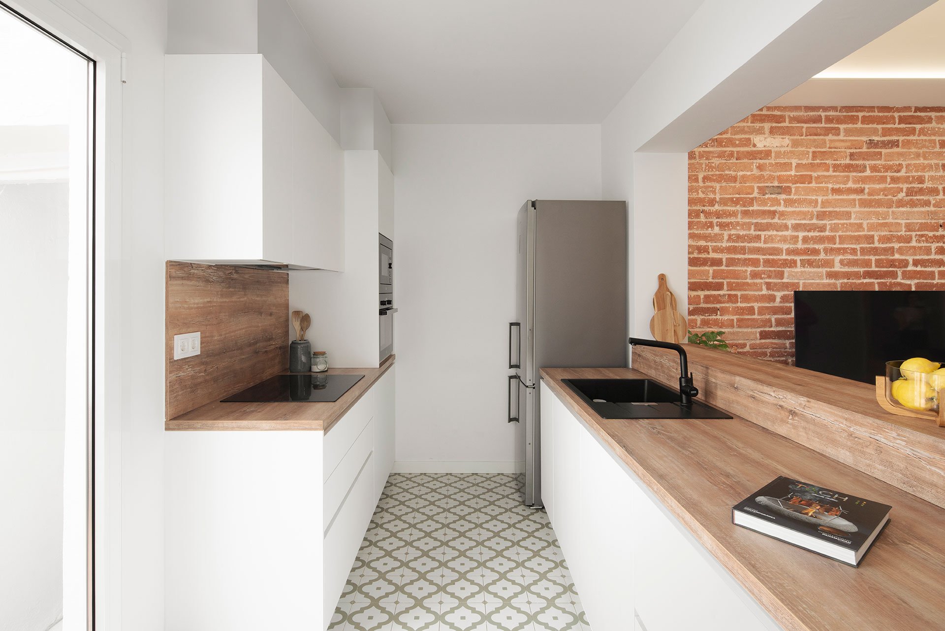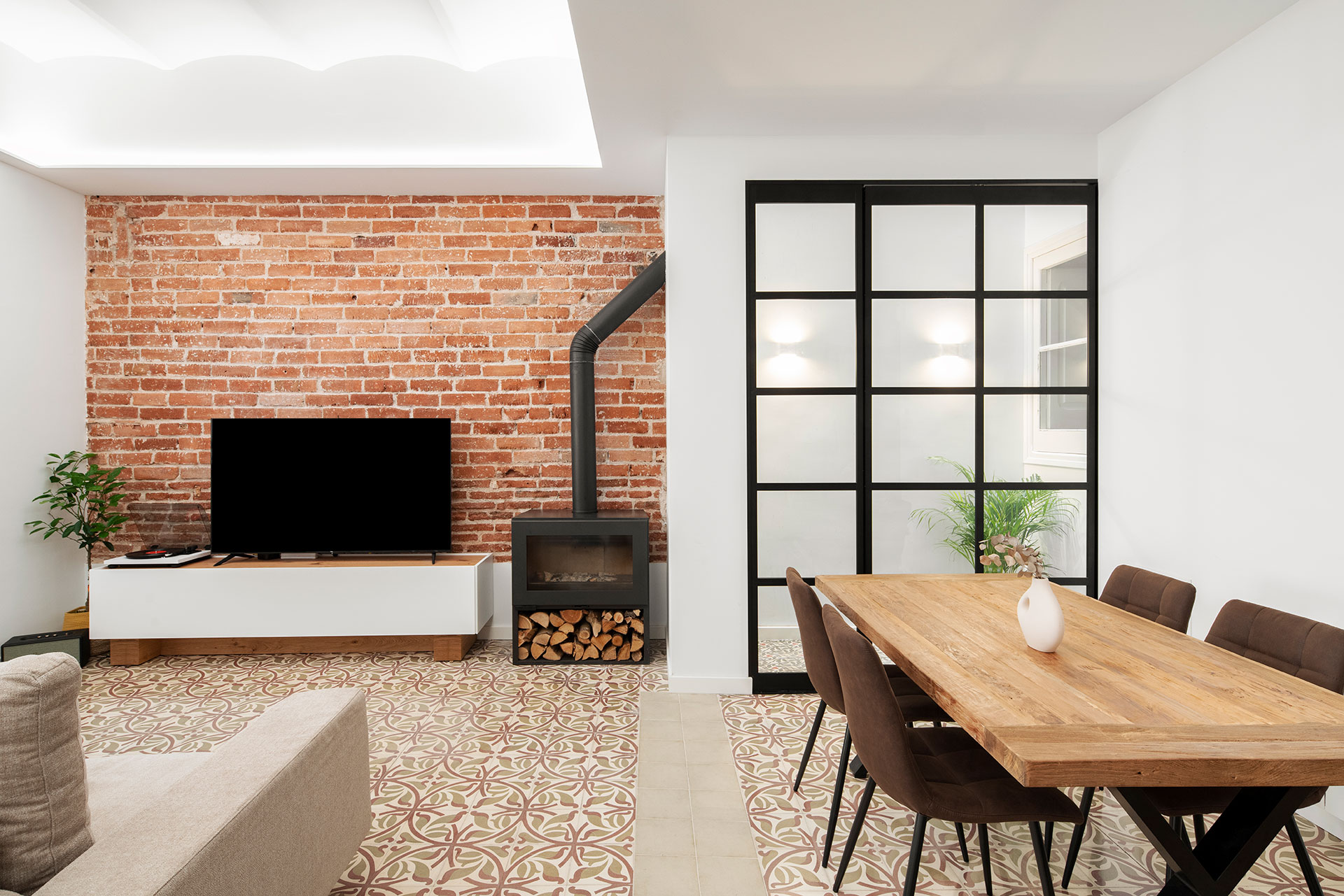 Durante la reforma, se recuperaron elementos originales como los suelos hidráulicos y las carpinterías interiores, que aportan carácter al espacio. Además, se unificaron y ampliaron algunos espacios para crear unas estancias con dimensiones más acordes al tamaño de la vivienda.