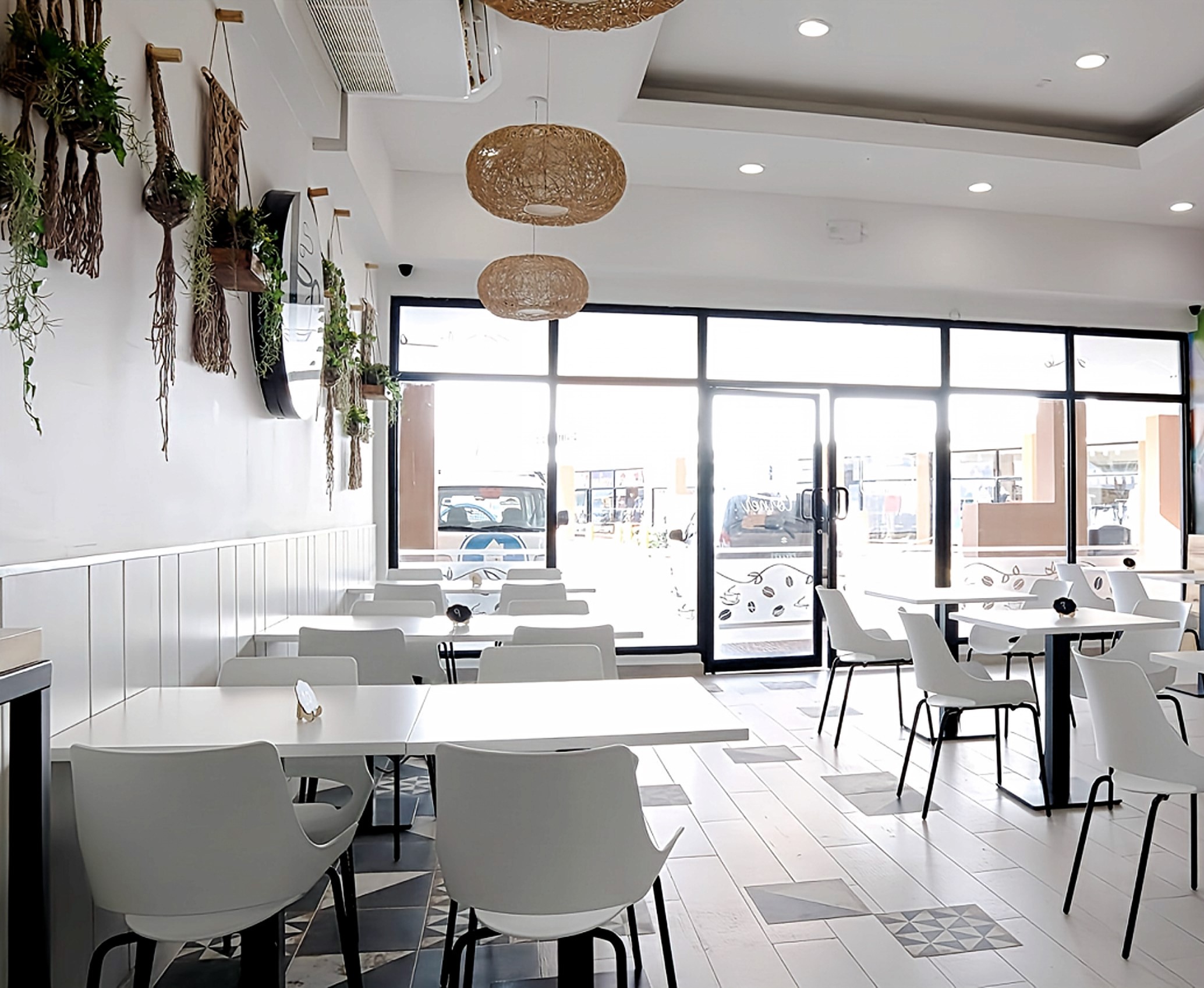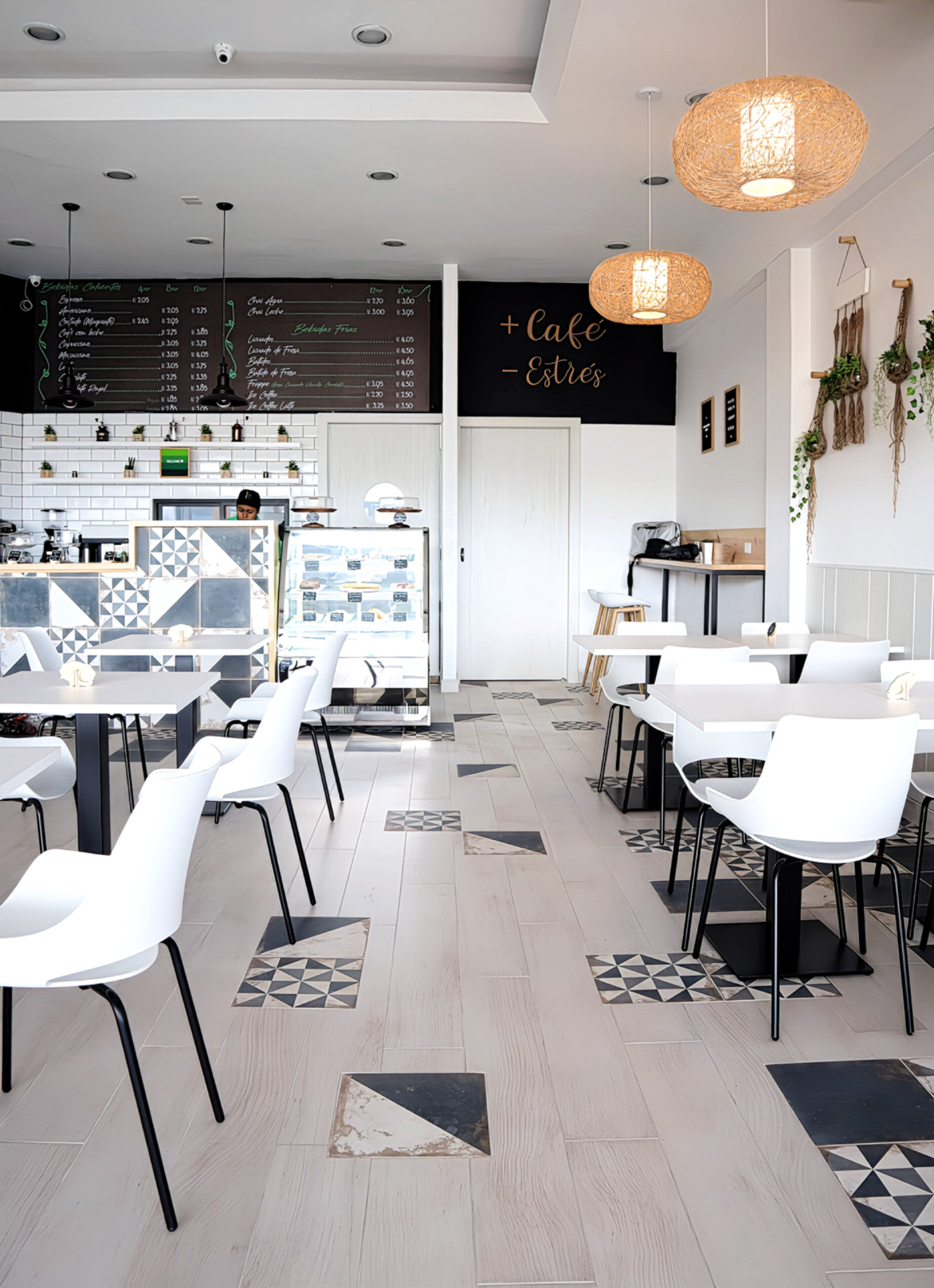 El concepto busca frescura y luminosidad, con una base neutra en tonos blancos y maderas claras, sobre la que destacan detalles en macramé, mimbre y vegetación suspendida.